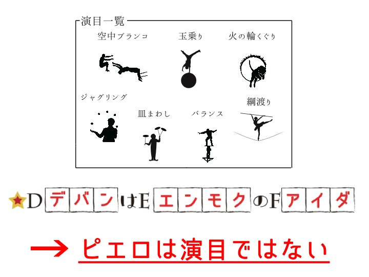 ピエロを含めないでさっきの情報から演目の順番がわかるよ。