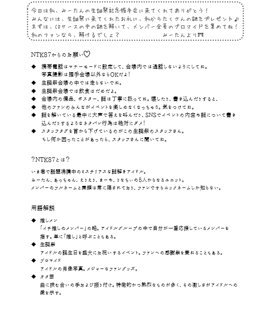 難易度・物調整や不快な要素を減らそうとギリギリまで意見を出し合ってきたので、少しでも多くの方に謎解きって楽しい!って思っていただけたら幸せです。