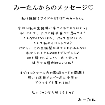3分以内にみーたんの本名を導き出し、それを握手券に正しく記入して私に提出してください。」