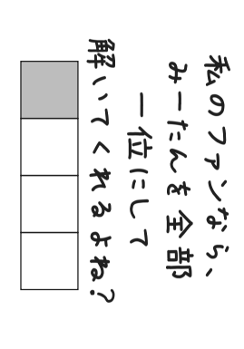 今度はみーたんを全て一位に、つまりかぎかっこの一文字目を拾って読んでみましょう。