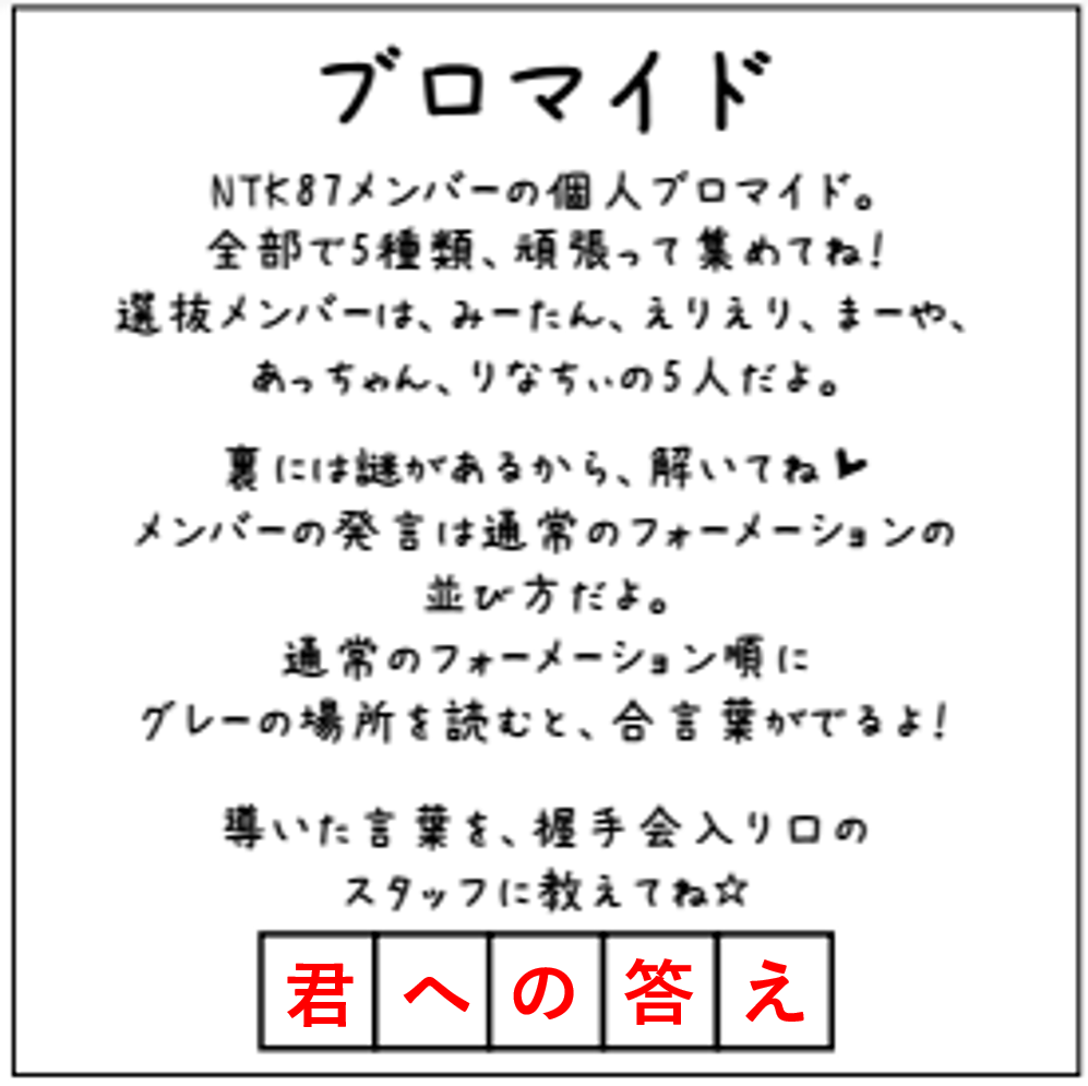 写真のように、それぞれのブロマイドの裏にはみーたんからの問題が書いてあります。