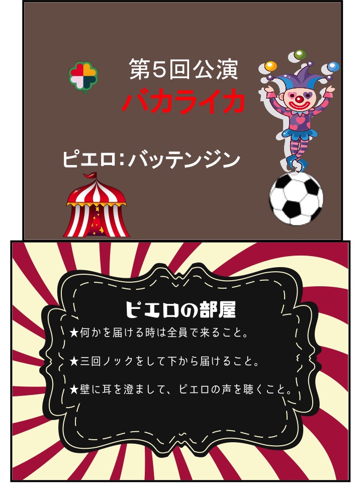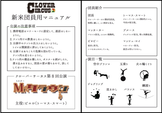 (ここだけ補足します。左からシガーボックス、ディアボロ、キリンの形をしたバルーンアート、フラフープ、団長の持っているパフパフの形をシルエットでそれぞれ表していました。