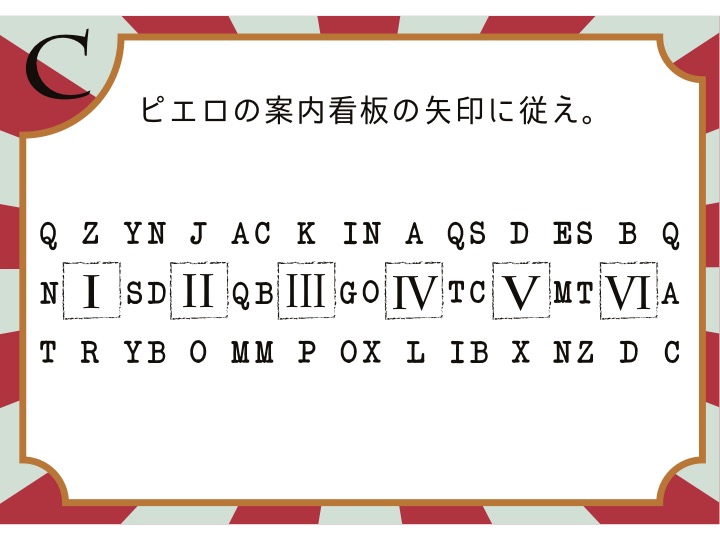 Cの問題。ピエロの案内看板は、テント内にあった6枚の写真にあったね。